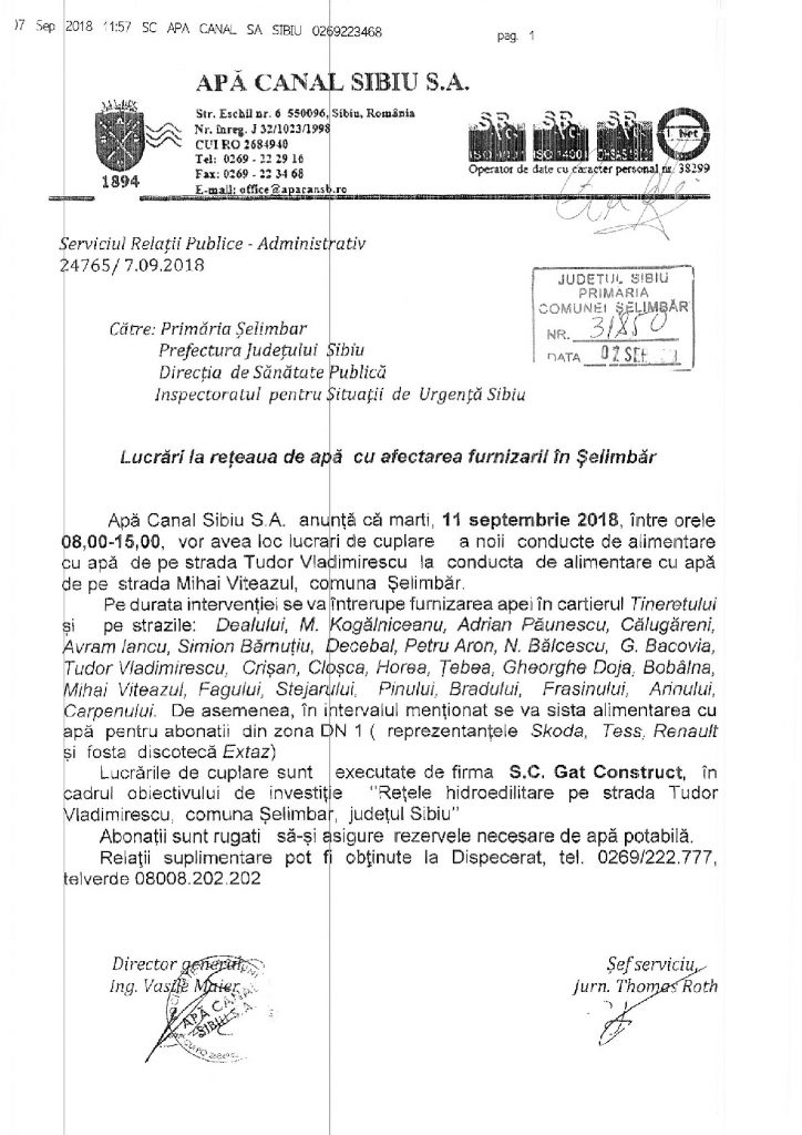 Primaria Comunei Selimbăr anunță intenția de a cumpara un teren în localitatea Șelimbăr, zona str. Doamna Stanca, identificată în perimetrul cuprins în schița anexata în HCL nr. 65 din 30 iunie 2017 (www.primariaselimbar.ro), conform investiției “cumparare teren in vederea constructiei de gradiniță, cresa, parc de joaca – Str. Doamna Stanca”, cu suprafața de 4000 mp., aprobat în bugetul local la sursa de finantare 02, capitolul 65.02.71.01 cu nr. 66320/07.03.2018 și un teren în localitatea Șelimbăr, zona str. Pictor Nicolae Brana, identificată în perimetrul cuprins în schița anexată, care face parte din HCL nr. 64 din 30 iunie 2017 (www.primariaselimbar.ro), conform investiției “cumparare teren în vederea constructiei de gradiniță, cresa, parc de joaca – Str. Pictor Nicolae Brana”, cu suprafața de 400 mp. aprobat în bugetul local la sursa de finantare 02, capitolul 65.02.71.01 cu nr. 66320/07.03.2018