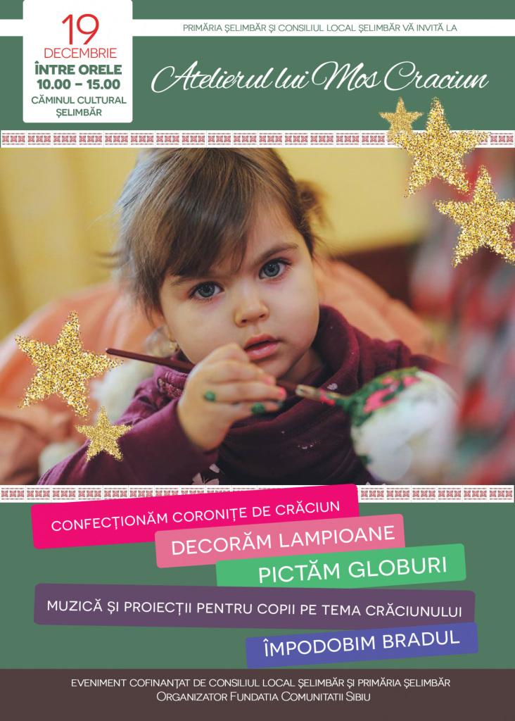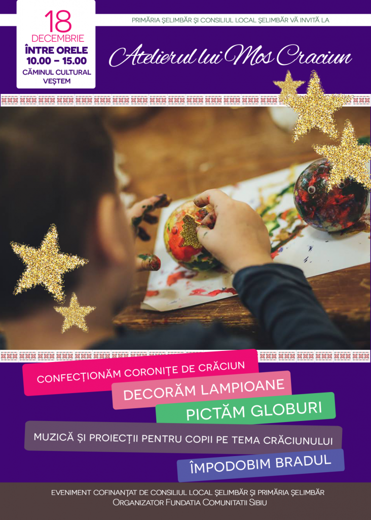 Marți, 18 decembrie, și miercuri, 19 decembrie, toti copiii din Șelimbăr și din Veștem, sunt invitați să participe la atelierele de creație organizate de spiridușii Moșului.